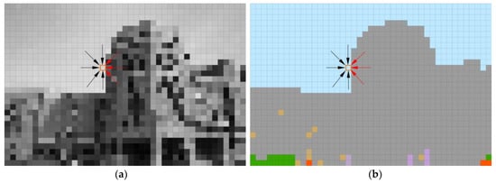 In the above equation, the value of γ is 48, and the other parameters are the same as in Equation (10). The weights of the grayscale criterion and the semantic criterion are 0.8 and 0.2, which are summarized through the experiments. Our purpose is to set an accurate P 2 penalty term for the path pointed by the red arrow in Figure 4 through semantics, and then to obtain the accurate disparity of the pixel. Compared with using only the grayscale criterion to calculate the penalty term P 2 and judging the continuity of depth, using semantic weighted Formula (15) can calculate a more accurate disparity.