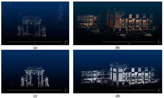Figure 11. Comparison of results of dense reconstruction of Tsinghua Life Sciences Building: (a) reconstruction results using the original SGM method and without post-processing; (b) reconstruction results using the semantic-based sSGM method and without post-processing; (c) reconstruction results using the original SGM method and with filtering; and (d) reconstruction results using the semantic-based sSGM method and with filtering.