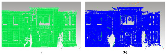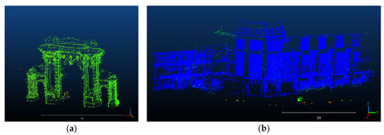 Figure 8. Visualization of sparse point cloud accuracy evaluation results: (a) Tsinghua University’s Old Gate and (b) Tsinghua Life Sciences Building. In the color transitions from blue to green to red, blue indicates smaller errors and red indicates larger errors. The assignment of colors was based on relative error values.