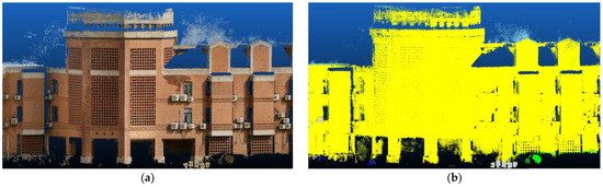 Figure 10. Dense point cloud reconstruction results: (a) the dense point cloud of the Tsinghua Life Sciences Building reconstructed using the original SGM; and (b) the dense point cloud of the Life Sciences Building reconstructed using sSGM based on semantics. Yellow points represent buildings, green points represent vegetation, gray points represent static-other, dark blue points represent bicycles, and light blue points represent sky.