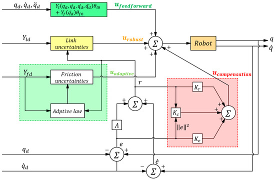 In this section, a robust adaptive controller based on the desired trajectory is designed to meet the control tasks of the universal six-axis manipulator. In summary, the controller consists of four parts. The first is the nominal dynamics feedforward term calculated by the desired trajectory. The second is the robust term to correct the perturbation of the inertial parameters of the links. Then, the adaptive term is used to learn the friction coefficients of the joints online. Lastly, a compensation term is designed to satisfy the Lyapunov stability of the system. The control scheme is shown in Figure 1.