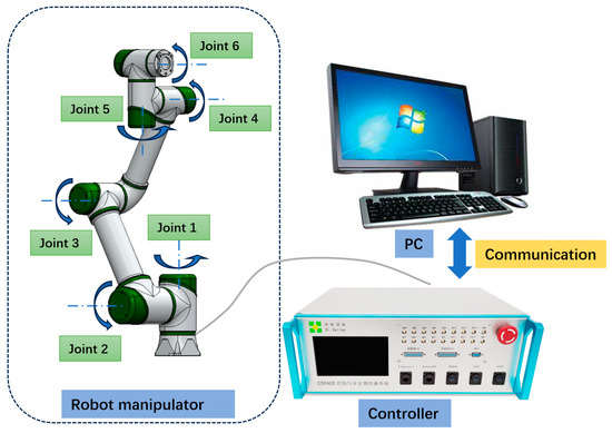 In recent years, robots have been widely used in industrial automation [1,2], the service industry [3,4], and the medical field [5,6]. In many applications, trajectory tracking control of robots is key to ensuring their accurate execution of tasks. In the early days, the PID control method, which is widely used in linear time-invariant systems, was also used in robot control [7]. However, due to the strong nonlinearity and strong coupling of the robot dynamics, the PID method has great limitations and disadvantages in the high-precision tracking of the desired trajectory. In later studies, nonlinear control was shown to be effective by introducing a dynamic model into the robot control design [8,9,10]. The realization of this method depends on the accurate robot dynamic model. However, the robot system is very complex with many uncertainties, including the error of dynamic parameters of links, unmodeled dynamics, joint friction errors, and other uncertainties in the system itself [11,12,13], as well as being affected by external uncertainties such as environmental disturbances [14] and variable loads on the end-effector [15]. Therefore, it is difficult to obtain a complete and accurate dynamic model of the robot, which restricts this model-based control method.