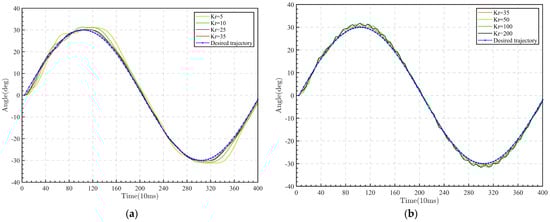 The following takes the second joint with the most complex dynamic characteristics as an example for parameters tuning. According to the closed-loop bandwidth, is selected. Figure 5 shows the results of the angular position of the second joint when a different was selected. Figure 6 shows the results of the corresponding angular position errors.