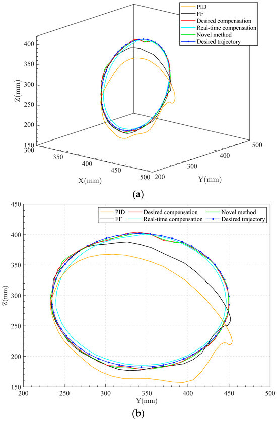 Motion trajectories of end-effector under different control methods: (a) in 3D space; (b) in YZ plane.