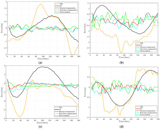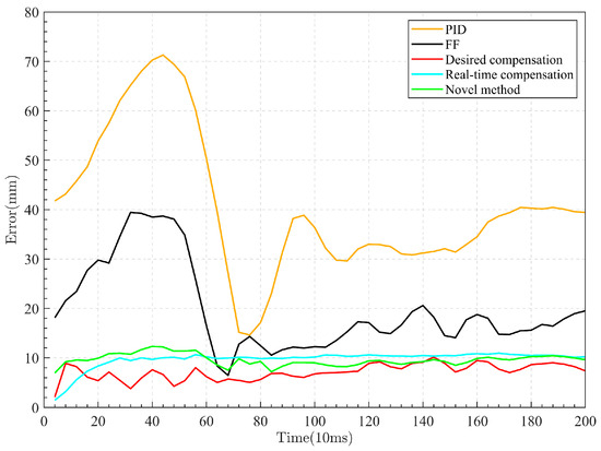 The legend of each control method is illustrated as follows: PID—traditional PID control; FF—dynamics feedforward control; desired compensation—the method proposed in this article; real-time compensation—real-time robust adaptive control; and novel method—novel robust adaptive control method proposed in the literature [27].