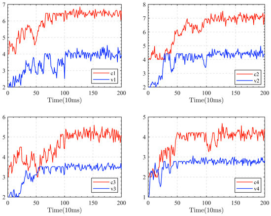 It can be seen from Table 1 that with the increase in , the relevant error indices demonstrated a trend from large to small and then to larger. The speed error reflects the shaking in the motion. Therefore, after weighing the two items of and , was selected as the final control parameter, and was selected accordingly. In Figure 5 and Figure 6, it can be found that the tracking performance of the red curve corresponding to had a significant advantage over other curves.