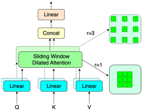 Among them, , , and are matrices of query, key, and value. They were the three feature matrices obtained by through CNN, and each row of these three matrices represented a query/key/value feature vector. For the query at position (, ), in the original feature mapping, the SWDA sparsely selected keys and values, with (, ) as the center, to perform the attention mechanism in sliding windows of different sizes, as shown in Formula (9).