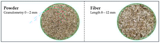 The two types of hemp additions used in this research are detailed in Figure 1. The powdered fraction has a particle size ranging from 0 to 2 mm, and the fibers have a length between 8 and 12 mm. The hemp material used belongs to the subspecies cannabis sativa and was extracted from the stalk of this plant, whose organic composition is cellulose (57–77%), hemicellulose (14–22.4%), lignin (3.7–13%), ash (0.8%), and wax (0.8%). Prior to their use, they were cleaned with pressurized water to remove existing polluting particles and then left to dry in an oven at a temperature of 24 ± 1 °C for 48 h. The final bulk density of these composites was 110 ± 5 kg/m3.