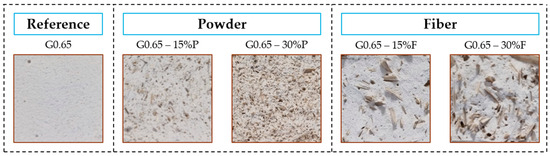 As shown in Table 7, there is a decrease in total water absorption as the content of added hemp material increases. This is attributed to the replacement of the original gypsum material with this plant-based addition, resulting in the composite retaining less water in its matrix. Similar observations have been made in prior research [11,58]. Additionally, it is observed that composites with hemp fiber addition exhibit a lower water absorption capacity compared to their counterparts with hemp powder. Similarly, the volume of pores accessible from the exterior is reduced, with the G0.65–30%F composite having the lowest open porosity.