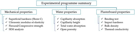 In this section, the tests conducted to carry out the physical and mechanical characterization of the composites developed in this research are described. Figure 3 outlines the developed experimental program in a schematic manner.