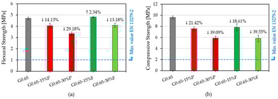 Similarly, the results from the compressive strength test are presented in Figure 4b. It can be observed that, in line with the surface hardness results obtained in Table 5, all the hemp-lightened composites exhibited a compressive strength lower than the reference material. However, even in the least favorable cases, G0.65–30%P and G0.65–30%F, where the decrease in compressive strength was close to 40%, all the analyzed composites exceeded the limit of 2 MPa set by the current regulations.