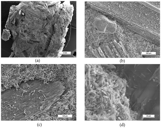 Finally, with the aim of understanding in detail the interface between the added hemp material and the gypsum matrix, an analysis was carried out through scanning electron microscopy. In Figure 5, the images obtained for the matrix of the G0.65–30%P composite are shown.