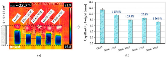 Complementary to this, a thermographic analysis conducted after the capillarity test is presented in Figure 7a, with Figure 7b showing the maximum water height reached in the various produced composites.
