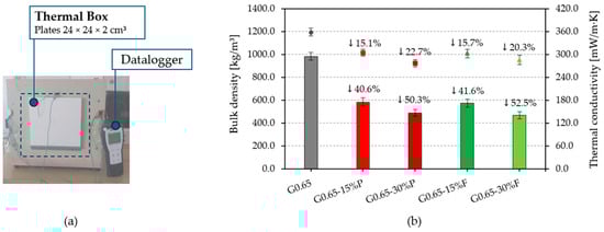 Determination of the thermal conductivity of the composites: (a) Thermal box used in the tests; and (b) results obtained for thermal conductivity and bulk density of the gypsum composites.