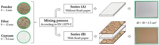 On the other hand, it is advisable to analyze the mechanical strengths of gypsum composite materials by testing samples with dimensions close to those used in their final form for commercialization. In this regard, two different types of panels with dimensions of 40 × 30 × 1.5 cm3 were designed. One of them was solely composed of the gypsum materials designed in this study, whereas the other, which was closer to reality, incorporated Kraft paper reinforcement strips on both sides of the prefabricated panels. This manufacturing process is schematically illustrated in Figure 9.