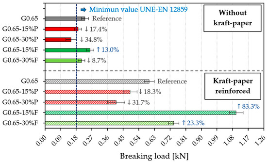 - The G0.65–15%F compound exhibited the best results in flexural strength tests, achieving higher strength values than the reference material G0.65. Notably, in the study with prefabricated elements, all panels made with Kraft paper reinforcement exceeded the minimum value set by regulations at 0.18 kN.