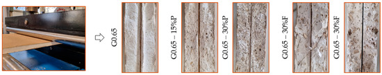 Once they had been prepared, the composites were cured under laboratory conditions at a temperature of 20 ± 2 °C and relative humidity of 50 ± 5% for a period of six days. Next, 24 h before conducting the tests, the samples were placed in a laboratory oven at a temperature of 40 ± 2 °C and relative humidity of 50 ± 5%, so as to ensure that all samples were tested under the same initial conditions. The composites’ final state, as well as the appearance of the matrices, can be seen in Figure 2.