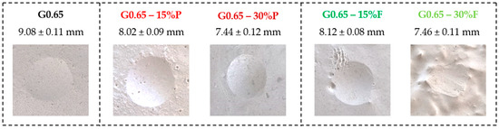Firstly, it is worth noting that none of the tested panels broke during the impact test, making all impacts valid. Additionally, it can be observed that all samples made with hemp as a partial replacement for the original gypsum material had a smaller indentation diameter than the G0.65 reference. There are hardly any differences between using hemp in powder or fiber form to mitigate the impact on the surface, which aligns with the results obtained for surface hardness presented in Table 5. In other research where recycled materials were used to make lightweight panels for false ceilings, similar results were obtained when using waste from end-of-life tires (ELT), such as recycled rubber or textile fiber [64].