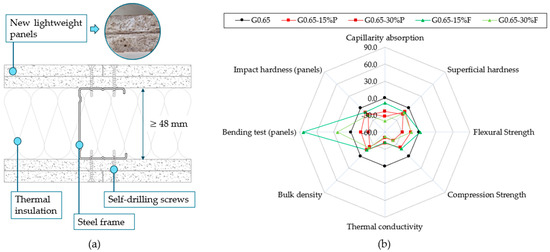 In this section, a synthesis of potential applications for the innovative materials developed in this research is provided based on the results obtained in the experimental campaign. In Figure 13a, a possible construction detail is shown for the application of these lightweight panels with hemp addition in the construction of lightweight partitions. Additionally, in Figure 13b, a comparative visual analysis is presented between the reference material G0.65 and the various composites developed, displaying the percentage variation in each analyzed property for each dosage with respect to this traditional composite.