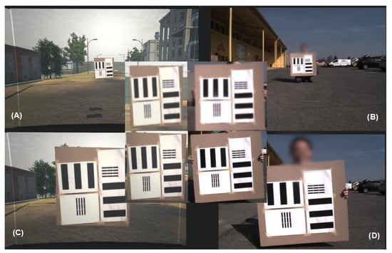 Images showing a comparison between the simulation (A,C), and a photo taken with the physical camera (B,D), the pairs (A,B) as well as the pair (C,D) were both taken at roughly the same distances. The center 4 images are the calibration markers from the corresponding images at different distances to calibrate the virtual focal length.