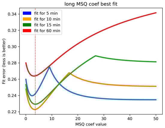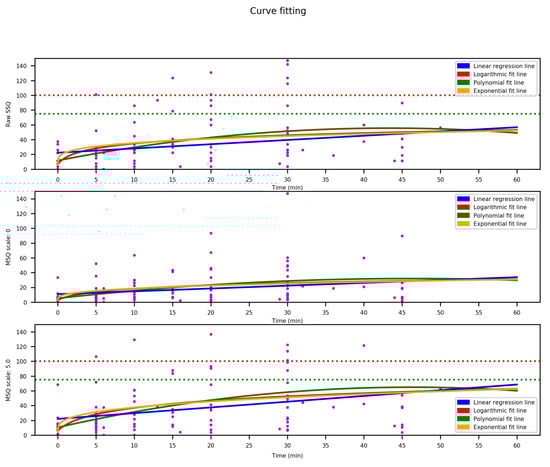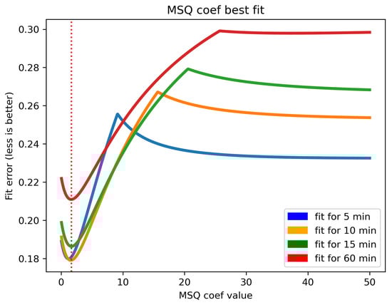 Fluctuations in the best fit suggested an insufficiency of data, hinting at the challenges of conducting longer-duration tests. Here, the coefficient value ranged from to , with coefficients exceeding yielding more stable MSQ scaling results compared to those based on data from all experiment durations. This phenomenon can be attributed to the dominance of 15 min samples, which seemingly lacked sufficient time to allow motion sickness effects to stabilize.