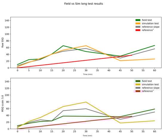 The literature references a rapid evaluation technique for the Simulator Sickness Questionnaire SSQ, termed the verbal Fast Motion Sickness (FMS) score. Although evidence suggests a correlation between FMS and SSQ, the FMS method was not adopted in these particular tests due to concerns about the method’s precision [].