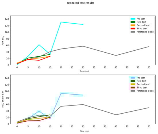Motion sickness is a variable and often perplexing phenomenon in VR experiences. The individual susceptibility to VR-induced motion sickness can greatly differ among users. The literature has pointed toward a potential solution—a weak correlation between pre-test MSQ scores and subsequent SSQ scores []. This revelation opens the possibility of using MSQ scores to normalize SSQ values and establish a more uniform measure of motion sickness severity.
