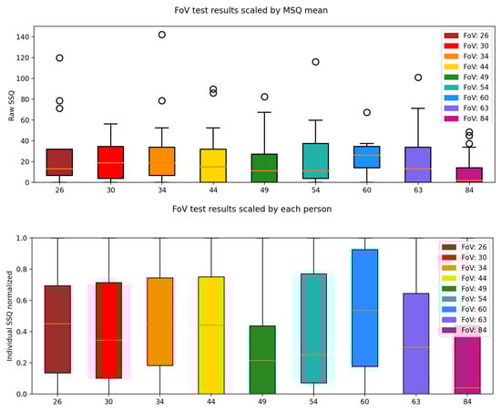 The SSQ is a survey-based tool developed by Kennedy et al. [] to quantify the severity of motion sickness symptoms experienced by participants in response to VR stimuli or simulators. Comprising 16 items, the questionnaire prompts respondents to rate their symptoms on a scale ranging from 0 to 3, reflecting the intensity of their discomfort. The items cover various aspects of motion sickness, including nausea, disorientation, and general discomfort. The SSQ effectively gauges the extent of an individual’s motion sickness experience, allowing for a comprehensive assessment of their susceptibility to this phenomenon. During this study, only the overall SSQ score was used to evaluate different conditions.