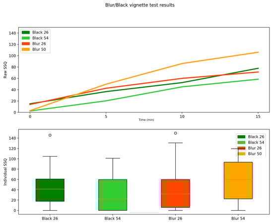 An additional test was proposed and conducted after seeing the findings from blurred and FoV tests. The idea was to test blur as a means of reducing FoV artificially while maintaining some semblance of peripheral vision. For this, a new setup was created where the periphery of the VR view was blurred to match the best-performing reduced FoV values. The chosen FoV were 26 deg and 54 deg as they stood out in the raw FoV test data. As this new rendering pipeline introduced additional input delay, new control tests were conducted with the same size black vignettes as the blurred periphery.
