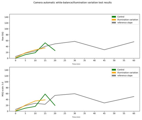 From the tests we conducted, there seems to be a very minor difference between users being exposed to cameras with varying illumination settings and uniformly illuminated cameras. The recorded SSQ scores indicate that illumination variance may have a subtle effect on MS when compared to the control setting. Verbal responses indicated a lack of a visible difference or affirmed the findings of Kala et al. [] that increased illumination and overexposure increase the effects of MS. The findings of the illumination experiment can be seen in Figure 17 and in the Table 3.