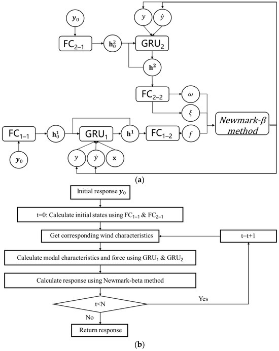 With unknown modal and aerodynamic characteristics and the corresponding aerodynamic force of a full-scale bridge, the VIV model cannot be employed to predict the VIV response. Therefore, there raises a need to employ a data-driven model as an alternative. However, the usual black-box data-driven model lacks interpretability, which demands a physics-informed architecture to enhance the physical meaning. In this paper, we propose to embed the Newmark-beta method which is a numerical method for solving dynamic equations inside the recurrent calculation of a GRU neural network, by which the GRU neural network outputs the estimated modal characteristics and the aerodynamic force and the Newmark-beta method calculates the corresponding response according to Equations (2)–(9). The diagram of the proposed model is shown in Figure 2a. As shown in Figure 2a, two GRU neural networks and four fully connected (FC) neural networks are employed in the proposed model. One GRU neural network is employed to generate the hidden-state vector of modal frequency and modal damping, and the other GRU cell is employed to generate the hidden-state vector of normalized aerodynamic force.