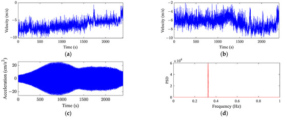 The investigated bridge has suffered from a number of vortex-induced vibration events during the last few years. The VIV events are identified with a clustering-based identification method [10,27]. In the identified VIV events, different mode frequencies are observed, which are 0.18 Hz, 0.28 Hz, 0.33 Hz, 0.38 Hz, 0.44 Hz and 0.50 Hz. Among these different modes, the number of VIV events of 0.33 Hz is 31, while the numbers of VIV events of other frequencies are all less than 15. Therefore, to take the amount of data into consideration, the monitoring data of VIV events of 0.33 Hz are collected as the dataset to validate the proposed model. A typical VIV event is shown in Figure 4, where the blue color indicates the time series and the red color indicates the power spectrum density (PSD).