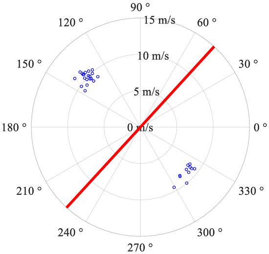After the preprocessing, a dataset that consists of 31 VIV events of 0.33 Hz for validating the proposed model is built. The specifics of the dataset can be summarized as follows. The built dataset contains both wind characteristics and vibration characteristics. The wind characteristics consist of wind speeds and angles of direction at 1/4 and 3/4 span of the main span, and the vibration characteristics consist of vertical acceleration, velocity and displacement of 1/2 span of the main span. The time resolution of the wind characteristics and vibration characteristics is the same, which is 0.5 s. The summary of statistics of the 31 events is shown in Table 1. A wind rose plot of 31 VIV events is shown in Figure 5 (the red line is the axis of the investigated bridge), where the blue color indicates the wind characteristics and the red color indicates the bridge. Histograms of the duration time and amplitude of VIV events are shown in Figure 6.