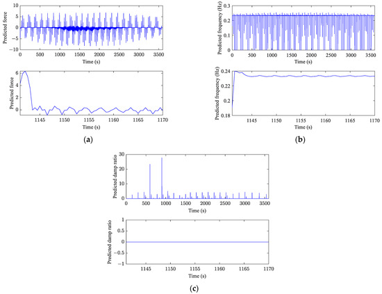 Middle outputs of typical prediction I: (a) predicted force; (b) predicted frequency; (c) predicted damp ratio.