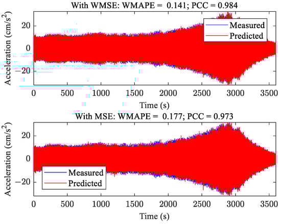 As shown in Table 3, the prediction accuracy of the model trained by optimizing WMSE is higher than that of the model trained by optimizing MSE, especially for WMAPE which put more emphasis on the amplitude. As shown in Figure 1, the model trained by optimizing WMSE can predict the VIV event of large amplitude more accurately than the model trained by optimizing MSE. Therefore, it can be concluded that the WMSE can aid in the accurate prediction of the amplitude of a VIV event.