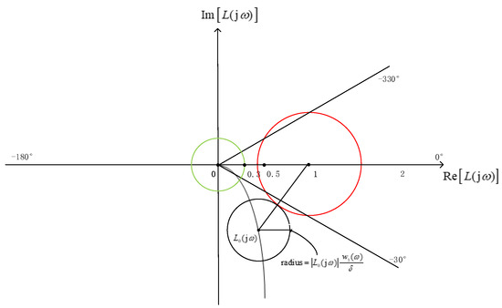 As shown in Figure 2, the open-loop transfer function is restricted to the disk whose center is the open-loop transfer function and whose radius is , resulting from the fluctuation of the secondary path transfer function. The Nyquist stability condition requires that all points in the disk do not pass through the point , and the radius is less than the distance between the center and .
