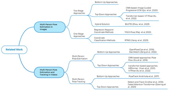 In recent years, there has been significant progress in the field of multi-person pose estimation in images. The current approaches can be categorized into two main categories: two-stage approaches and one-stage approaches. Figure 1 elucidates the taxonomy delineating the landscape of the related work [,,,,,,,,,,].