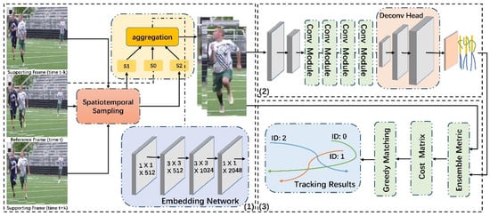 Firstly, we sample the reference frame and the supporting frames and from the given video, and then pass them through the same feature extraction network mentioned in Section 4.2. Let c denote the number of channels, h denote the height, and w denote the width of the feature map. This yields three groups of feature maps: , , and all possessing the same dimensions. Subsequently, we concatenate these three groups into a new feature map denoted as , , and ∈ . As a result, the feature map , , and now contains not only the information from the reference frame but also from the supporting frames.
