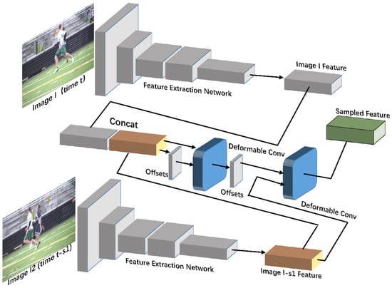 where S is the range of supporting frames for feature aggregation. Equation (1) bears similarity to the attention mechanism []. The adaptive weights signify the importance of each supporting frame to the reference frame , where k = 1, …, S denotes the index of the supporting frames. To compute the adaptive weights w accurately, we employ an embedding sub-network to learn the feature representations of video frames in a high-dimensional space. Specifically, at each location , if the newly sampled feature is similar to the feature , it is assigned a relatively large weight. Conversely, it is assigned a relatively smaller weight. In this case, we employ cosine similarity between the features extracted from the reference frame and each corresponding point in the newly sampled feature . Our embedding sub-network consists of four layers: a 1 × 1 × 512 convolution, a 3 × 3 × 512 convolution, and a 3 × 3 × 1024 convolution. It is randomly initialized.