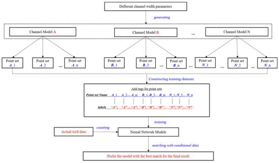 Deep learning has a strong nonlinear analysis ability, and the biggest advantage of this method is that it can extract key features through the independent learning of a large number of sample data, which can obtain a more accurate recognition effect [,]. Theoretically, the process of identifying the model with the highest match to the conditioned data is essentially a nonlinear problem of quantitatively evaluating the spatial structure characteristics of discrete distribution points’ similarity to regular gridded data. Therefore, we apply deep learning methods to identify the channel size, generate multiple candidate models with different channel widths through multi-point geostatistical methods, and then use deep learning methods to select the model that best matches the channel width in the study area from the multiple candidate models to quantitatively study the channel width in that area.