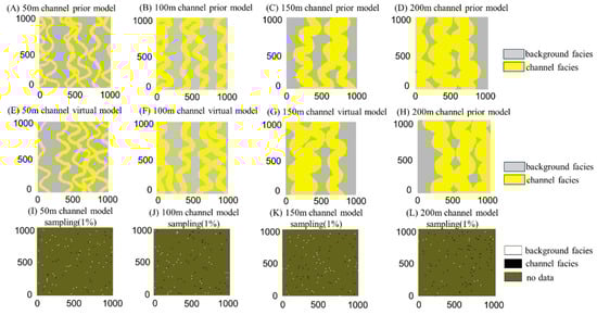 Figure 2 shows the models of four sedimentary facies with different channel widths. The parameters of the generated channel sand body model are shown in Table 1, with an NTG of 50%, an amplitude of 150 m, and a wavelength of 320 m; the width of the channel sand bodies follows the triangular distribution shown in Table 2. The channels of models A and E are densely distributed, and the width of each channel is relatively narrow. The channel widths of models B and F are medium. Models C and G have wider channel widths, and models D and H have the widest channel widths. Models E, F, G, and H are taken as virtual workspaces, and 1% of the data are randomly extracted from the virtual workspaces as conditional data. Then, 1% data points are randomly selected from candidate models A, B, C, and D, respectively, and each model is required to be sampled 100 times. Therefore, there are 400 random samples in the four models and every sample is assigned a label to recognize which candidate model it is part of. The labeling rule is that samples of the same model have the same label. Then, all 400 samples are trained in deep learning to obtain a deep convolutional network model.
