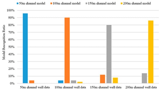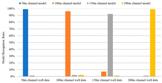 Through 50 tests, the results are shown in Table 4 and Figure 5. According to the results, the recognition rate of the 3D channel model with 50 m width is the highest, followed by the channel model with 100 m width, and both of them have a recognition rate of more than 90%. The recognition rate of the 3D channel width models with 150 m and 200 m is poorer, and is in the range of 80–90%. It can be seen that, compared with the 2D model, the method has a lower accuracy of the model training in the 3D space, but it also reaches a recognition rate of 80%. It is more sensitive to the width information.