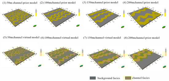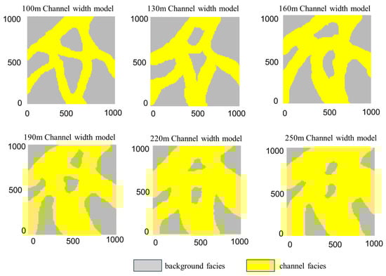 Fundamental to the search for the candidate model with the closest match to the conditioned data is the ability to quantitatively evaluate the similarity of spatial features between the discrete points and the grid. The candidate model does not need to satisfy the conditioned data as an a priori geological model, but must have spatial features similar to the conditioned data, such as the conditional data for the stable river phase, and the non-stationary sector model is obviously not the best option. This means that the more similar the spatial features of the candidate model are to the conditional data, the more similar the spatial features of the random sample based on the candidate model are to the conditional data. Therefore, during the test, except for the parameter of the channel width, the other parameters were kept unchanged to ensure the spatial similarity between the candidate model and the conditional data, and the results were only affected by the channel width parameter.