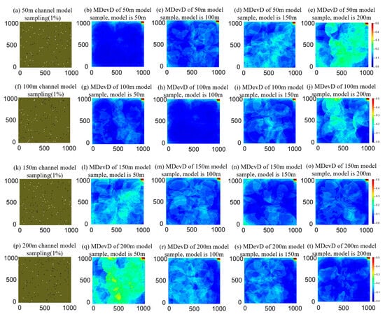 A comparative study was conducted using the 2D data in Section 2.3. Firstly, we randomly selected 1% of the data from four different channel models A, B, C, and D as the conditioned data, and then calculated the candidate models E, F, G, and H by applying the MDevD attribute of the conditioned data, respectively (Figure 6). The smaller the average value of MDevD, the higher the match between the candidate model and the conditioned data. The comparison of the test results between this paper’s method and the MDevD method was conducted 100 times, as shown in Figure 7. The results show that the recognition rates of this paper’s method and the MDevD method are very similar, indicating the reliability of the proposed method. In the process of 100 tests, the MDevD method takes a lot of time, with the total time consumption reaching 13.7 h, while the method proposed in this paper takes 53 s, indicating that the algorithm in this paper marks a great improvement in computational efficiency, and has a high degree of practicality.