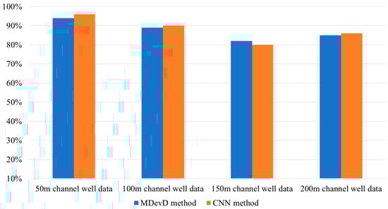 - A comparison of the method with the MDevD-based method was carried out to verify the practicality and reliability of the method, and it was demonstrated that the recognition rate of this paper’s method closely matches the MDevD method’s recognition rate, indicating the reliability of the proposed method. In the process of conducting 100 tests, using the MDevD method took a lot of time, with the total time consumption reaching 13.7 h, while the method proposed in this paper took 53 s, indicating that the algorithm in this paper marks a great improvement in computational efficiency, and has a high degree of practicality. It can be used to analyze the channel width of the actual work area, and provide more accurate guidance for oilfield development to formulate a more reasonable development plan.