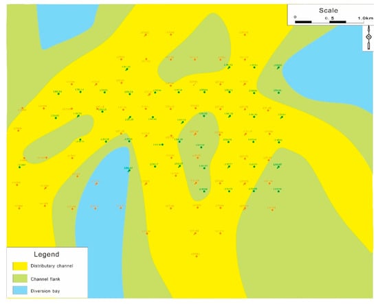 The candidate model’s data source is a sand layer in the Hu1 oil group of the L field. The reservoir in this area is of the braided river delta front deposition, the source is mainly from the N-NW direction, and the sedimentary microfacies are mainly distributary channels. Multi-stage channel deposits are developed on the plane, and the sand bodies between channels are in tangential and overlapping contact, with different reservoir properties in different channels. The development of sand body in this study area is relatively thin, the sand body thickness is generally less than 5 m, and the number of sand body developments is relatively small. The boundary of the channel was determined according to the thickness distribution map of the sand body, and the sedimentary facies map was established (Figure 9). The sedimentary micro geomorphological study indicated that the vertical flow profile was lenticular and the underwater distribution of the river channel oscillated faster.