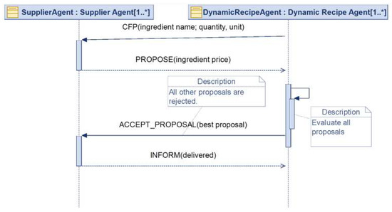There are two main JADE behaviors within a DRA, running simultaneously. The first behavior handles, continuously and through negotiation, the procurement of ingredients for the recipes (Figure 4 and Figure 5). In both diagrams, the FIPA Contract Net Protocol (CNET) [34] is considered.