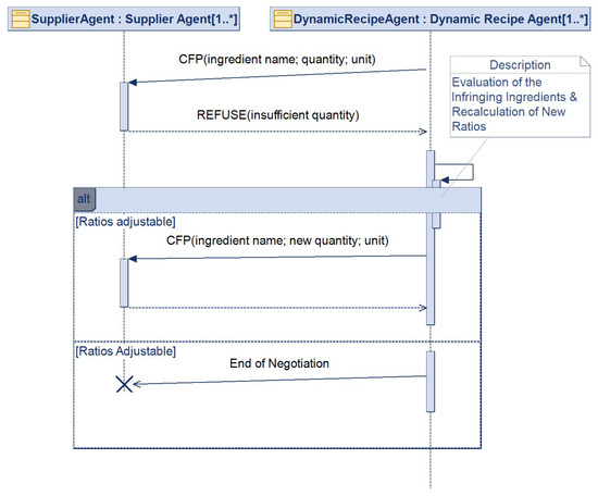 Certain protocol instances may fail due to the insufficient supply quantity on the suppliers side (Figure 5). In these circumstances, the DRA will recalculate the ingredient ratio, according to a specialized function that maintains the desired properties of the food being produced by a dynamic recipe, and will re-trigger negotiation for the recalculated ingredients. In certain cases, it may not be possible to recalculate the ratio, which causes the DRA to give up on the procurement process.
