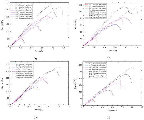 By comparing the failure modes of indoor experiments and numerical simulation experiments, we found that the calibrated numerical simulation model is basically the same in terms of crack development, as well as in terms of the failure mode, showing through-crack failure in oblique sections. The specific failure mode diagram is shown in Figure 4 below.