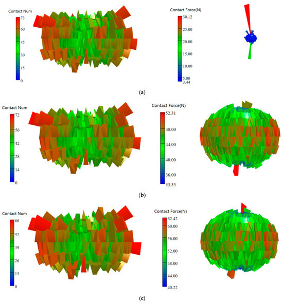 Rocks are often excavated in deep layers. In order to study the effect of hob temperature on the rocks of different excavation layers, the contact force of the particles after breaking the rocks was taken to make a three-dimensional group composition, and the change law of the contact force of the particles with an increase in temperature under different surrounding pressure conditions was analyzed. First of all, it can be seen from Figure 16 that in the early stages of rock breaking, the hob temperature is too low and the contact force of the rock body at this time mainly comes from the contact of the rock body on both sides when the hob squeezes the particles. As the temperature rises, the particle contact increases due to the effects of heat, and the increased force at this time mainly comes from the temperature and the tumbling force of the hob. After 600 °C, the cracks between the hobs penetrate each other and the rock was spalled in large quantities. The contact force of the rock on both sides mainly comes from the temperature change, and the contact force increases less at this time.